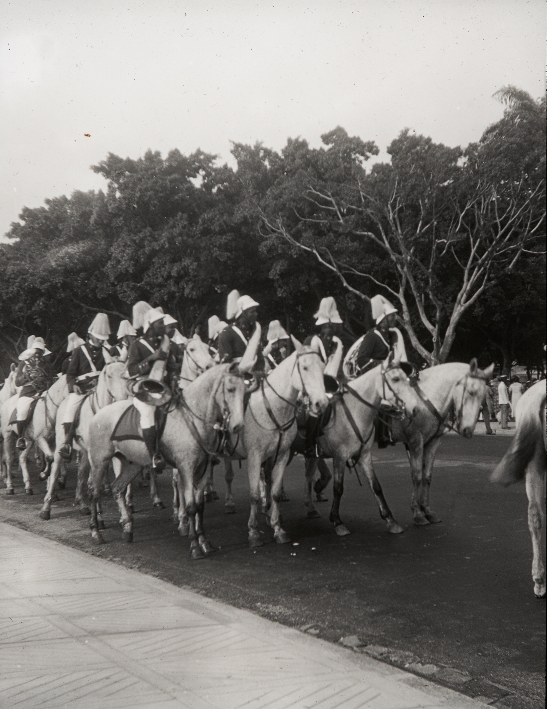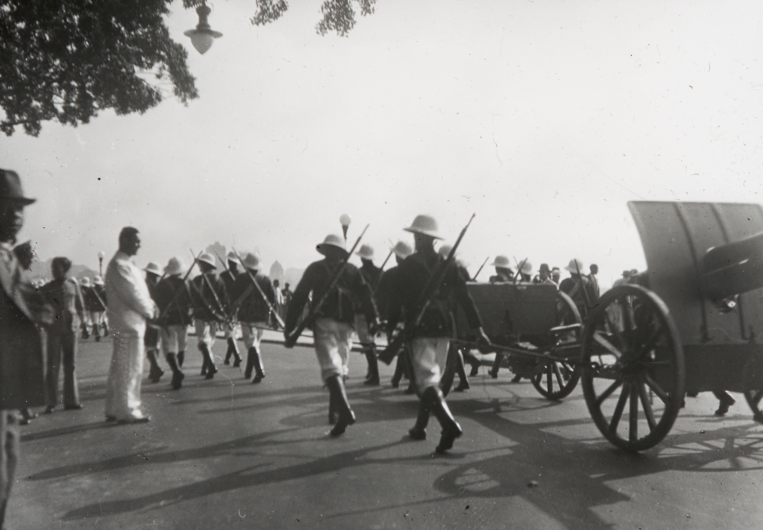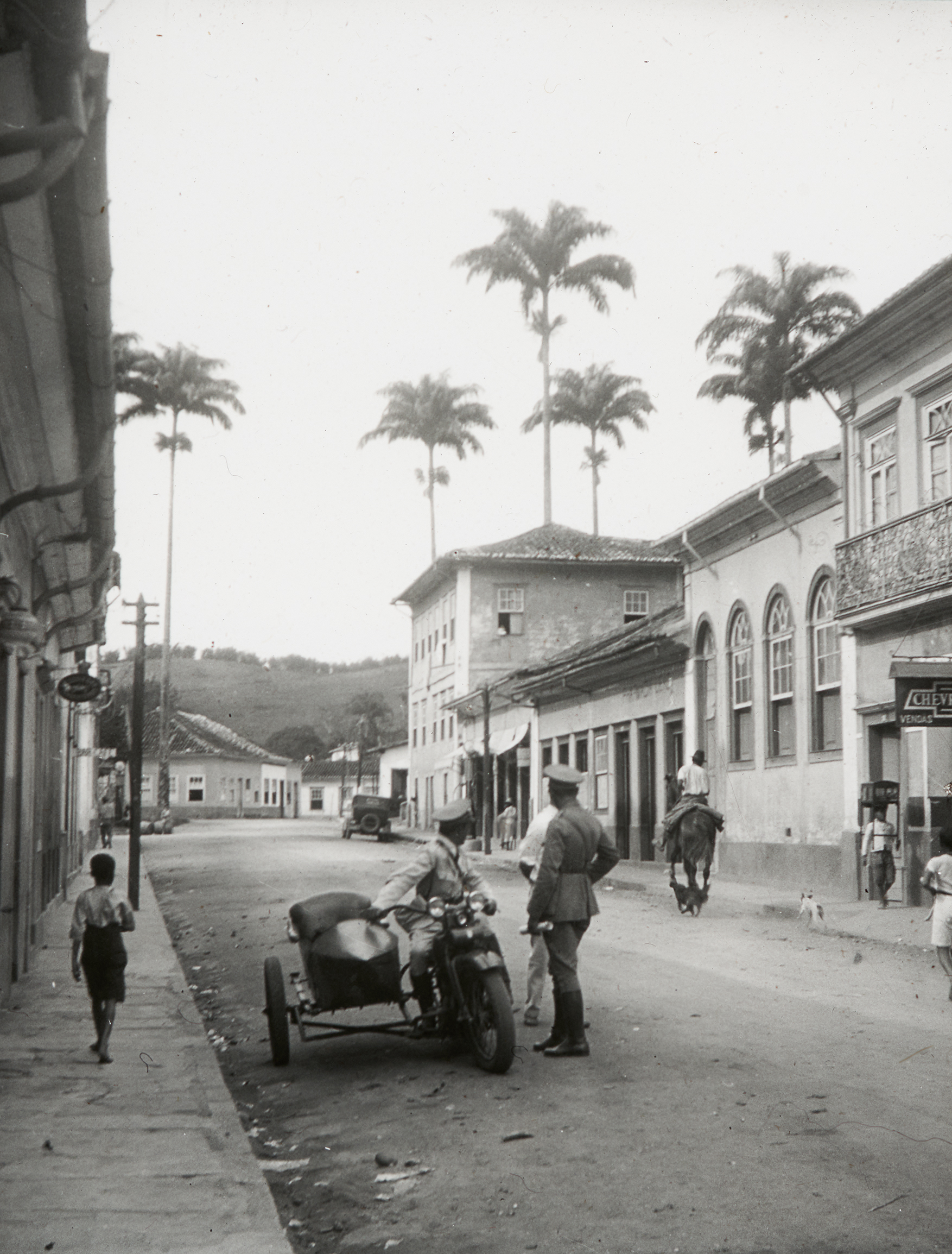 Auf dieser Straße befinden sich ein Motorrad mit Beiwagen und ein Reiter mit seinem Pferd. Außerdem sprechen zwei Männer in Uniformen mit einer weiteren Person.