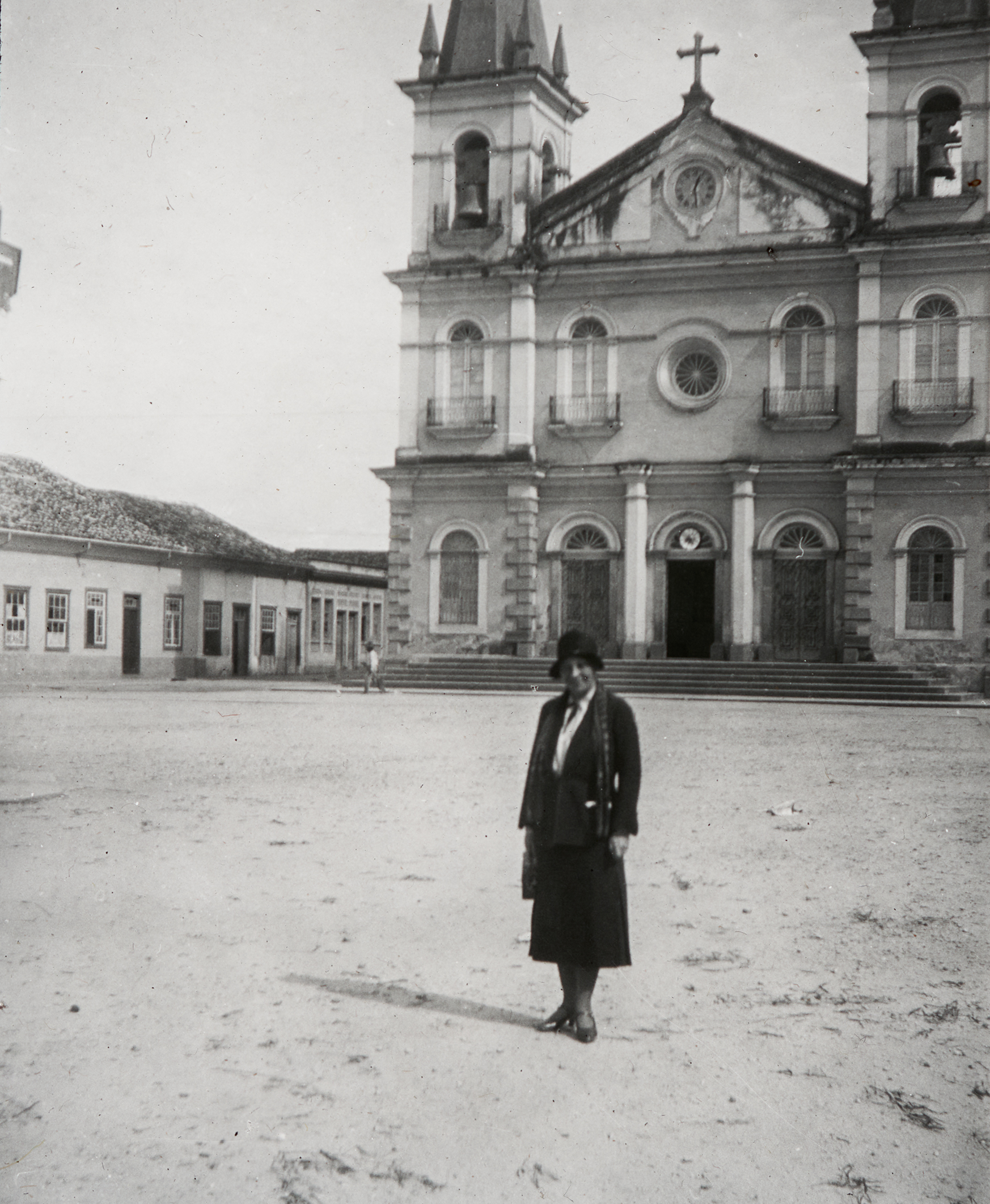 Diese Frau steht vor der Igreja Matriz Imaculada Conceição in Jacareí, einer Großstadt in Brasilien.