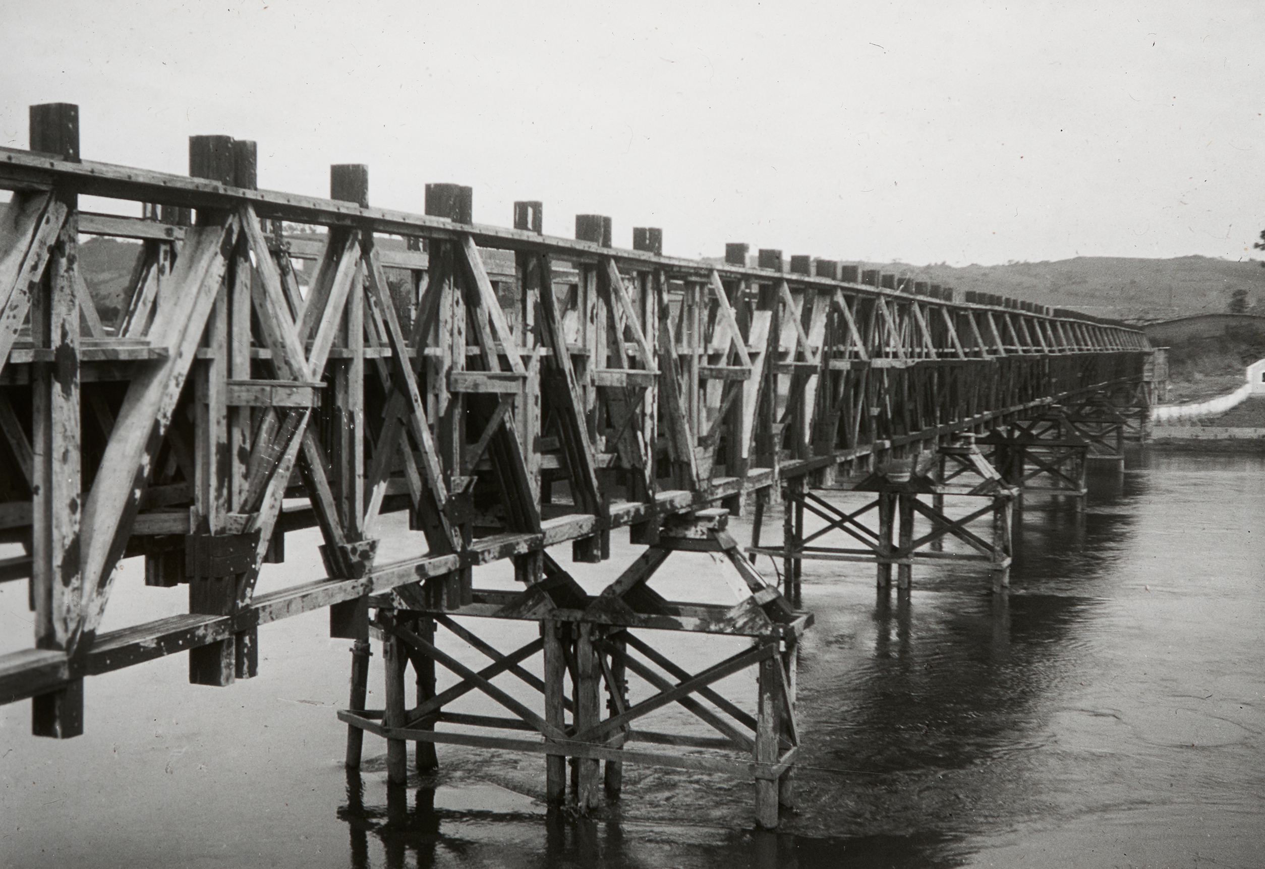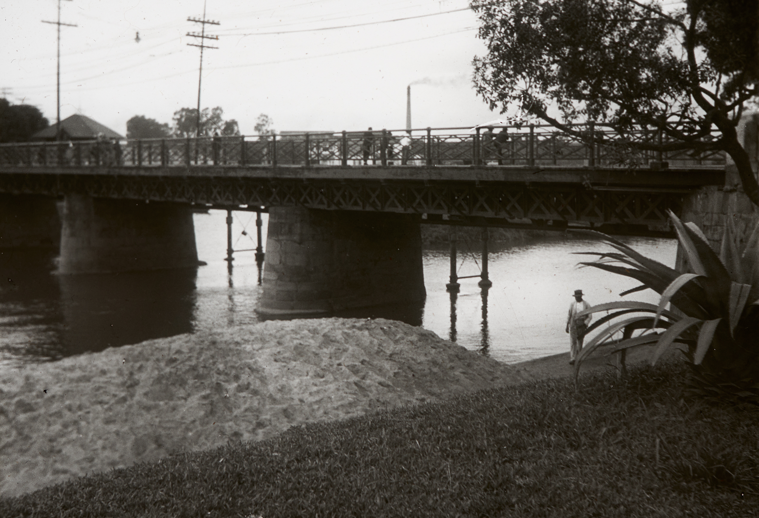 Man erkennt eine Person, die unter der Brücke hervorkommt. Auch auf der Brücke befinden sich Fußgänger.