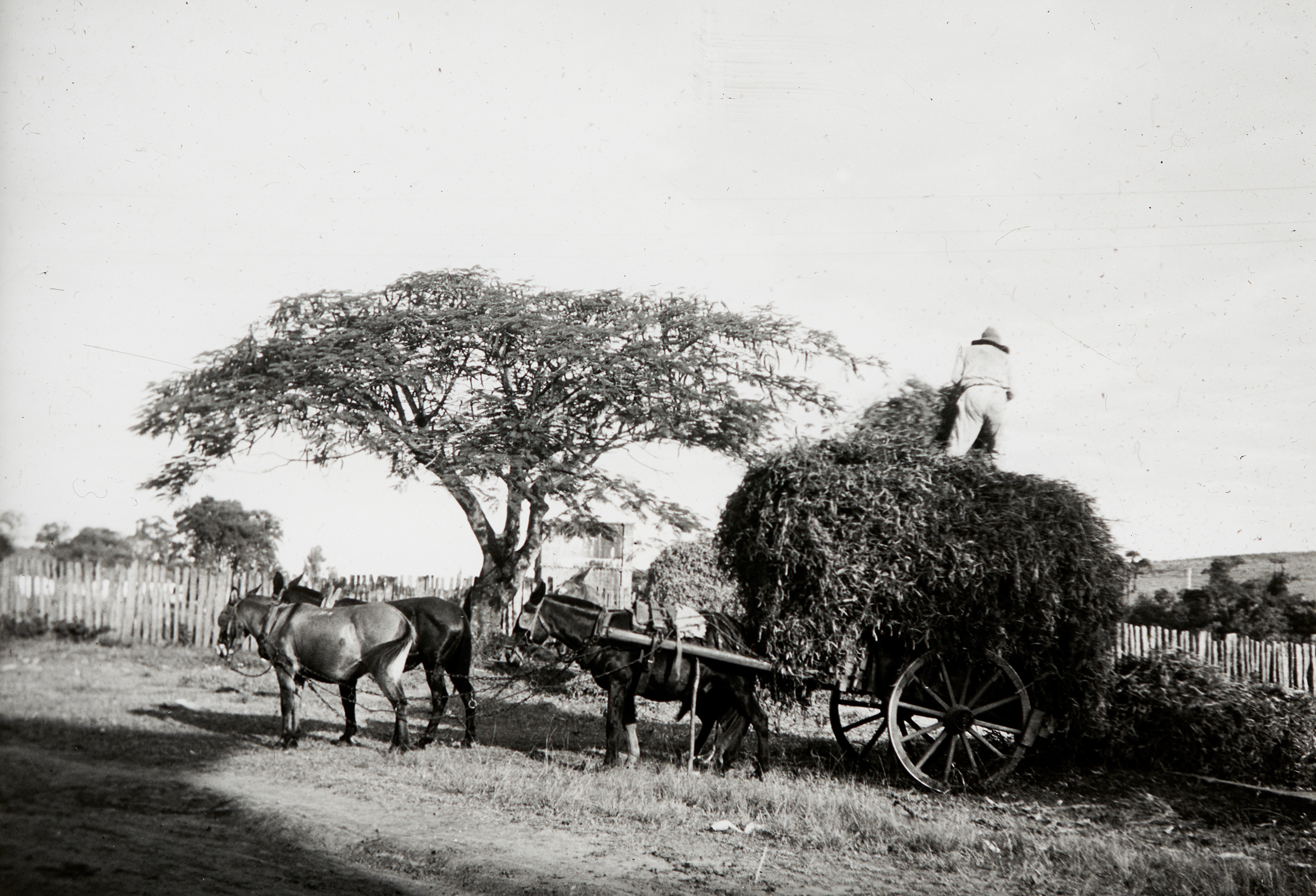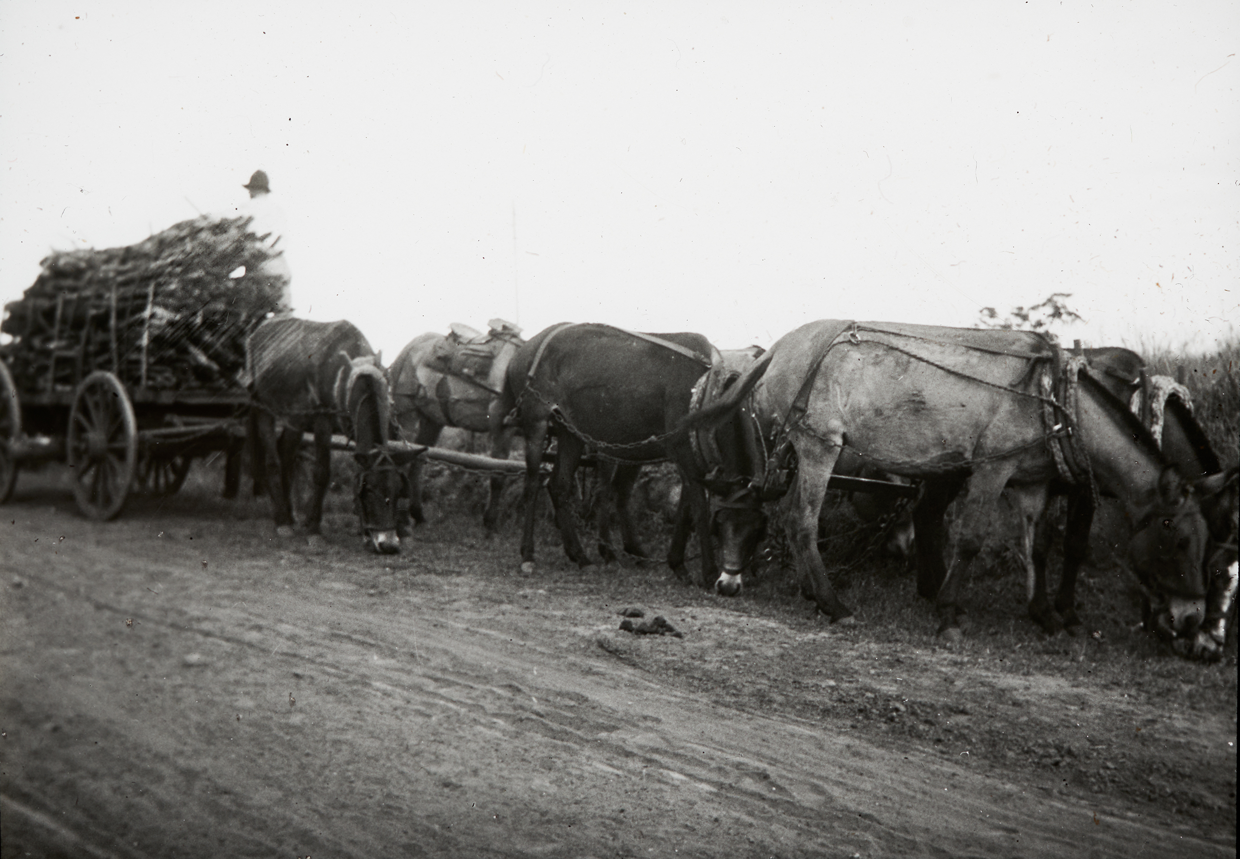 Mehrere Pferde sind vor einen Wagen gespannt, auf dem Holz befestigt wurde.