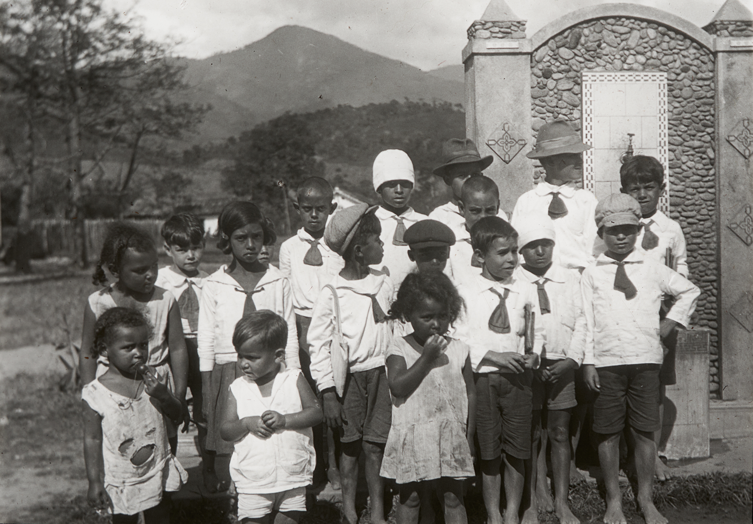 Eine Gruppe an Kindern, die vor einem Brunnen stehen.