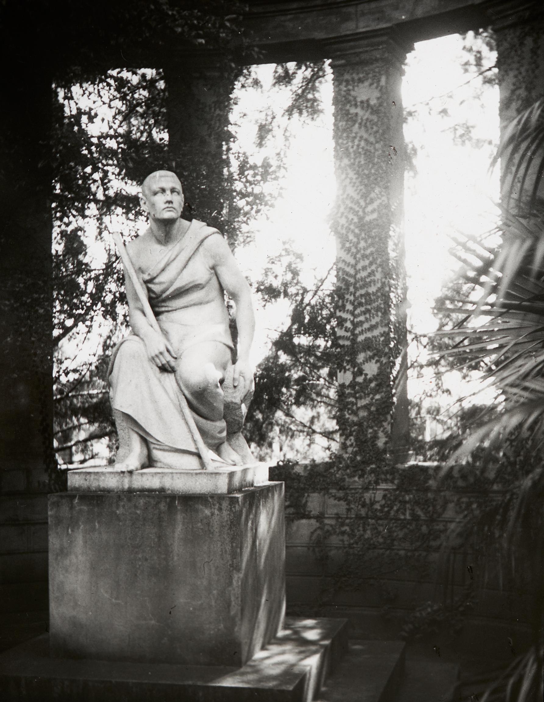 DIe Statue eines Mannes in Toga. Sie steht auf einem Podest in einem verwilderten Pavillon.
