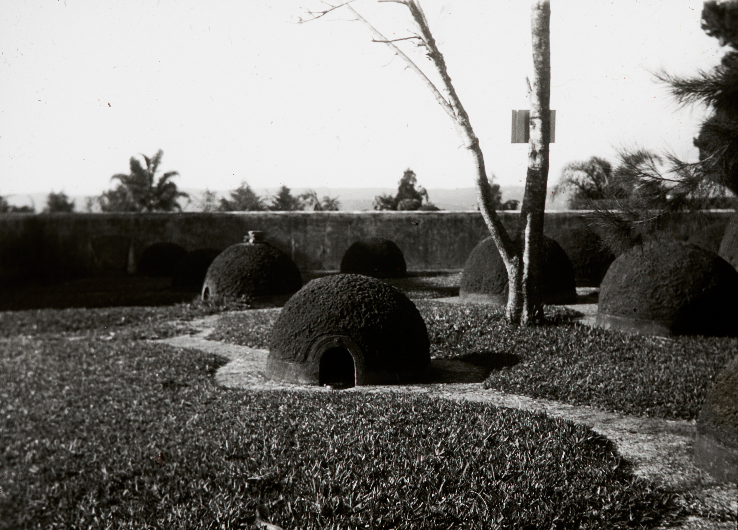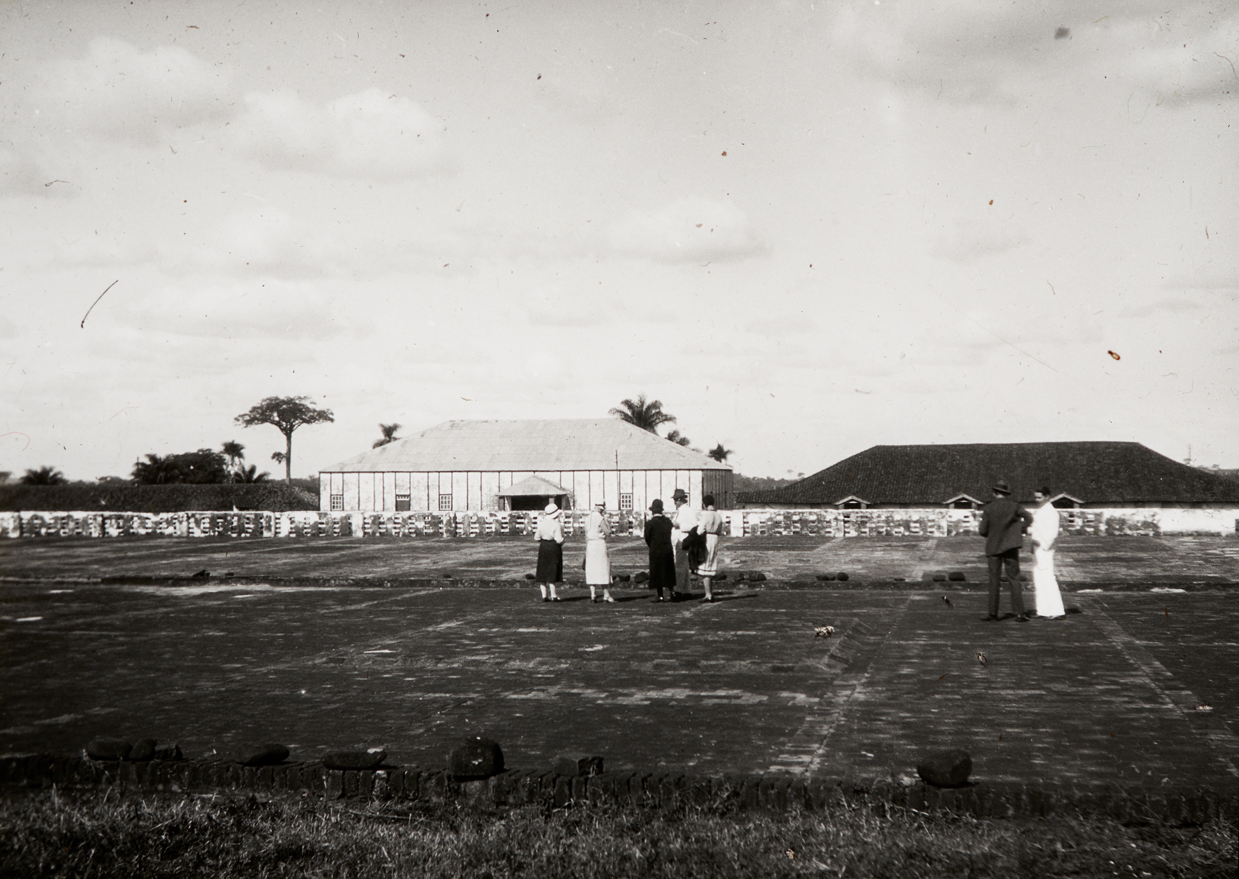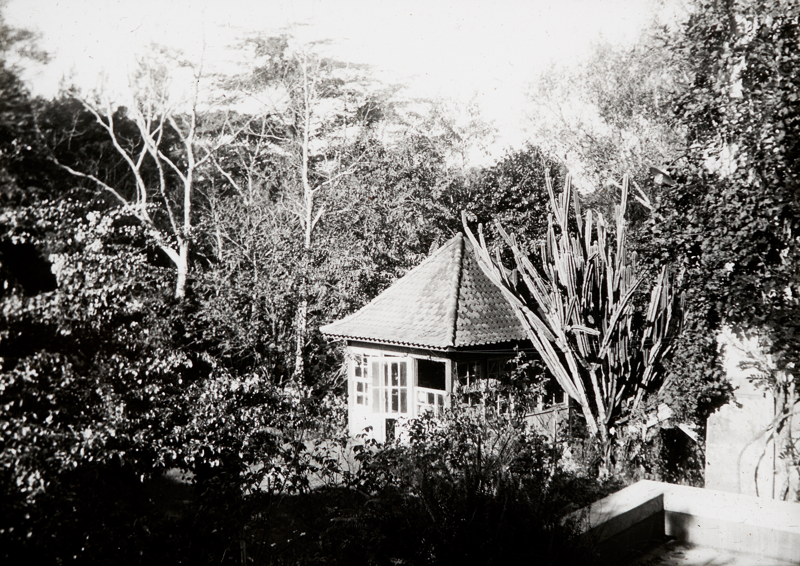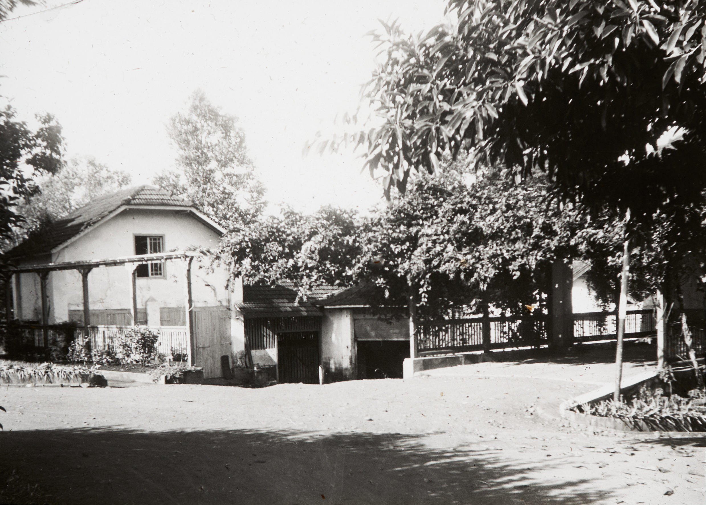 Ein Bungalow mit Ziegeldach. Im Hintergrund erkennt man große Palmen.