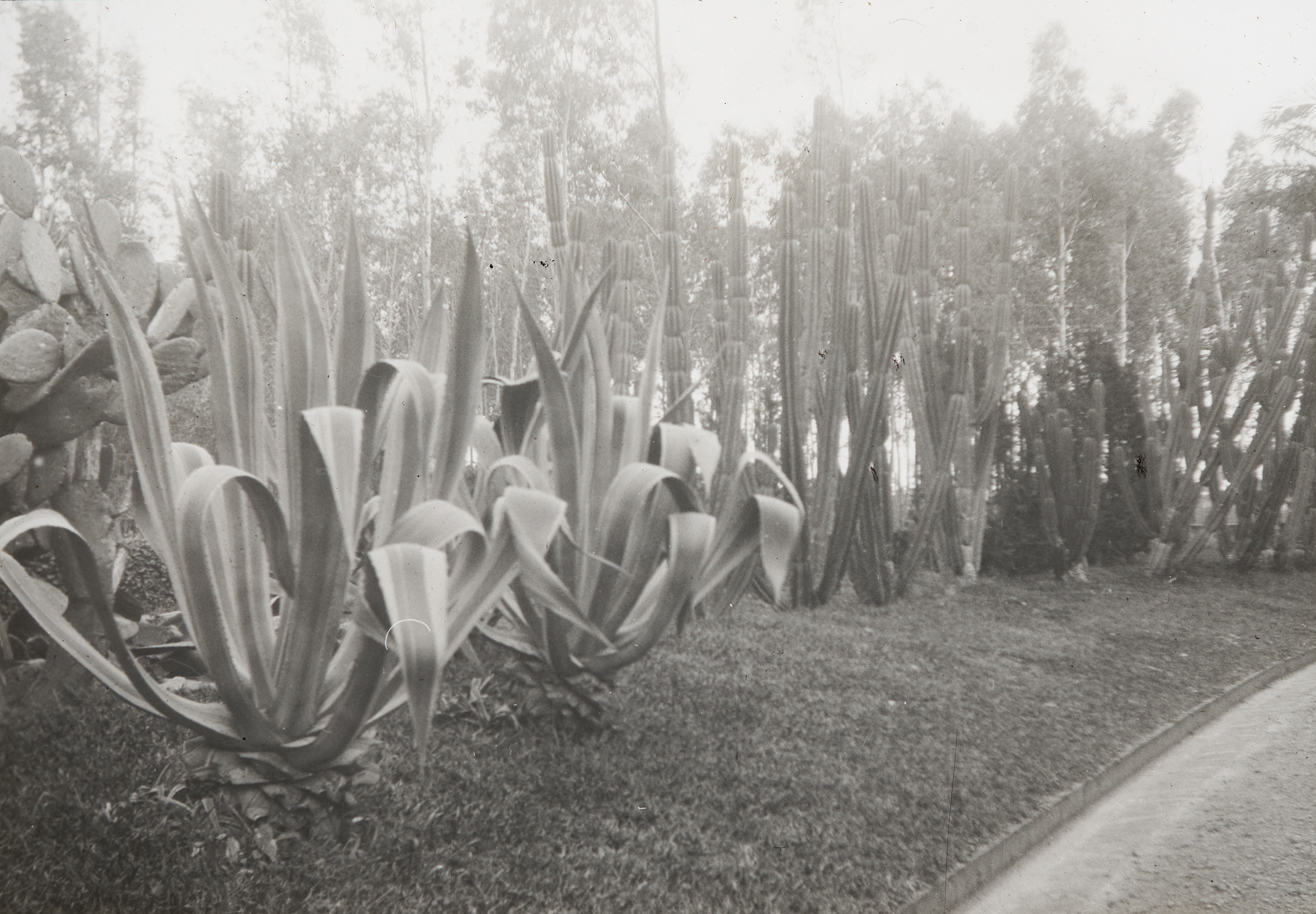 Neben einer Straße wachsen Agavenpflanzen und Kakteen.