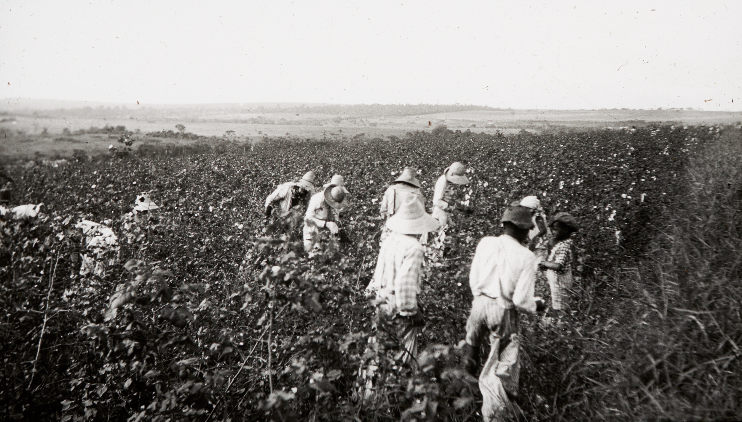 Mehrere Menschen, die in heller Kleidung auf einem Feld arbeiten.