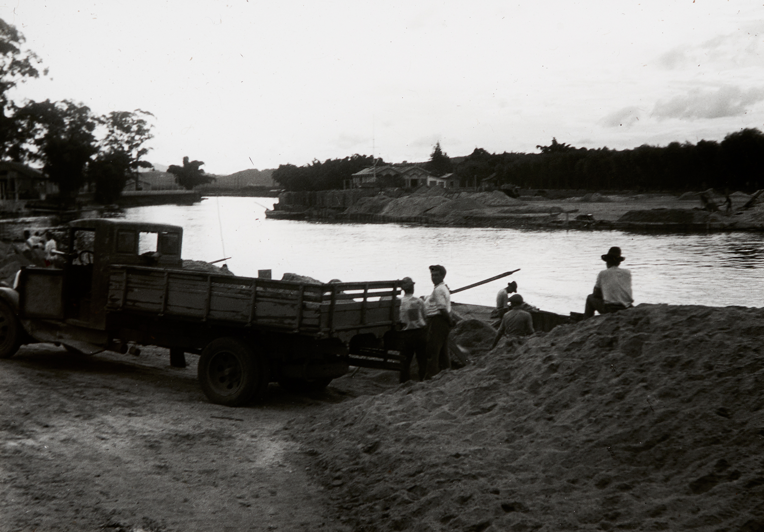 Mehrere Menschen, die sich am Wasser befinden. Daneben steht ein Arbeitsfahrzeug mit einer großen Ladefläche.