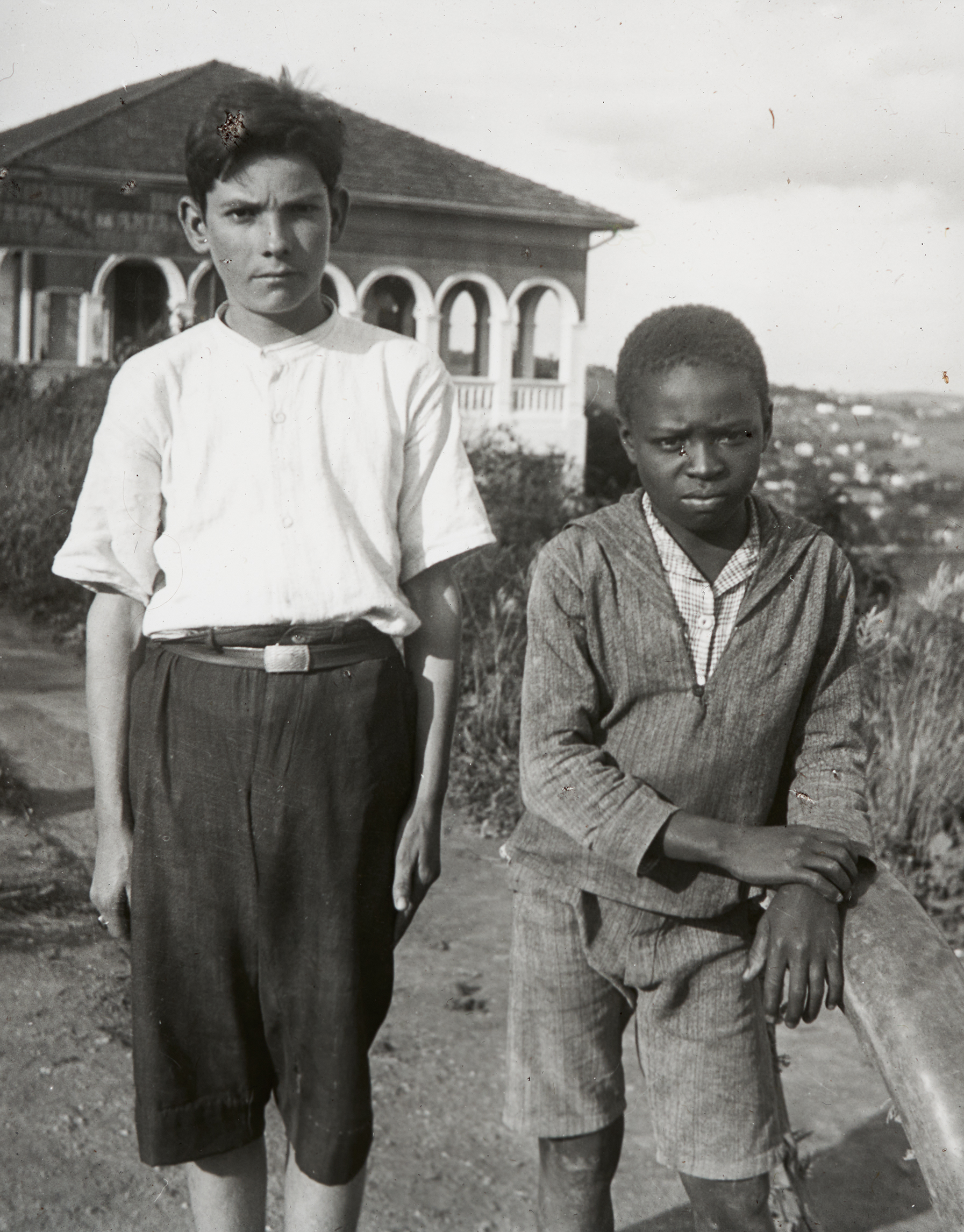 Zwei Buben, die nebeneinander fotografiert wurden. Der Bub rechts lehnt sich an ein Geländer.