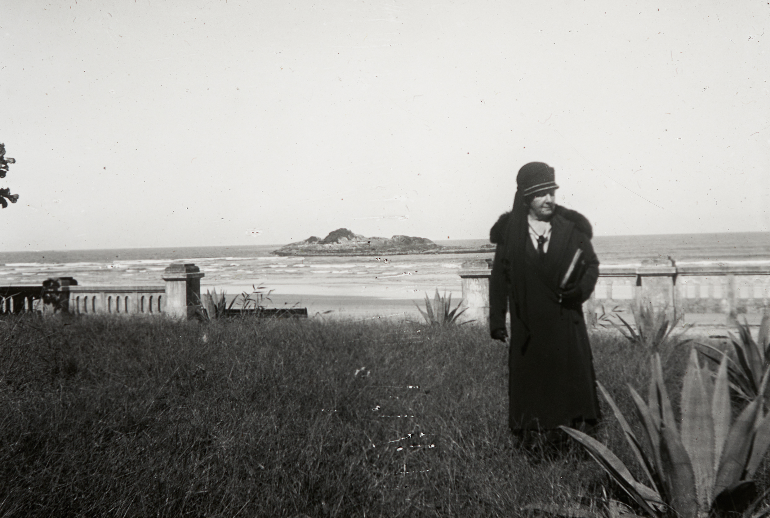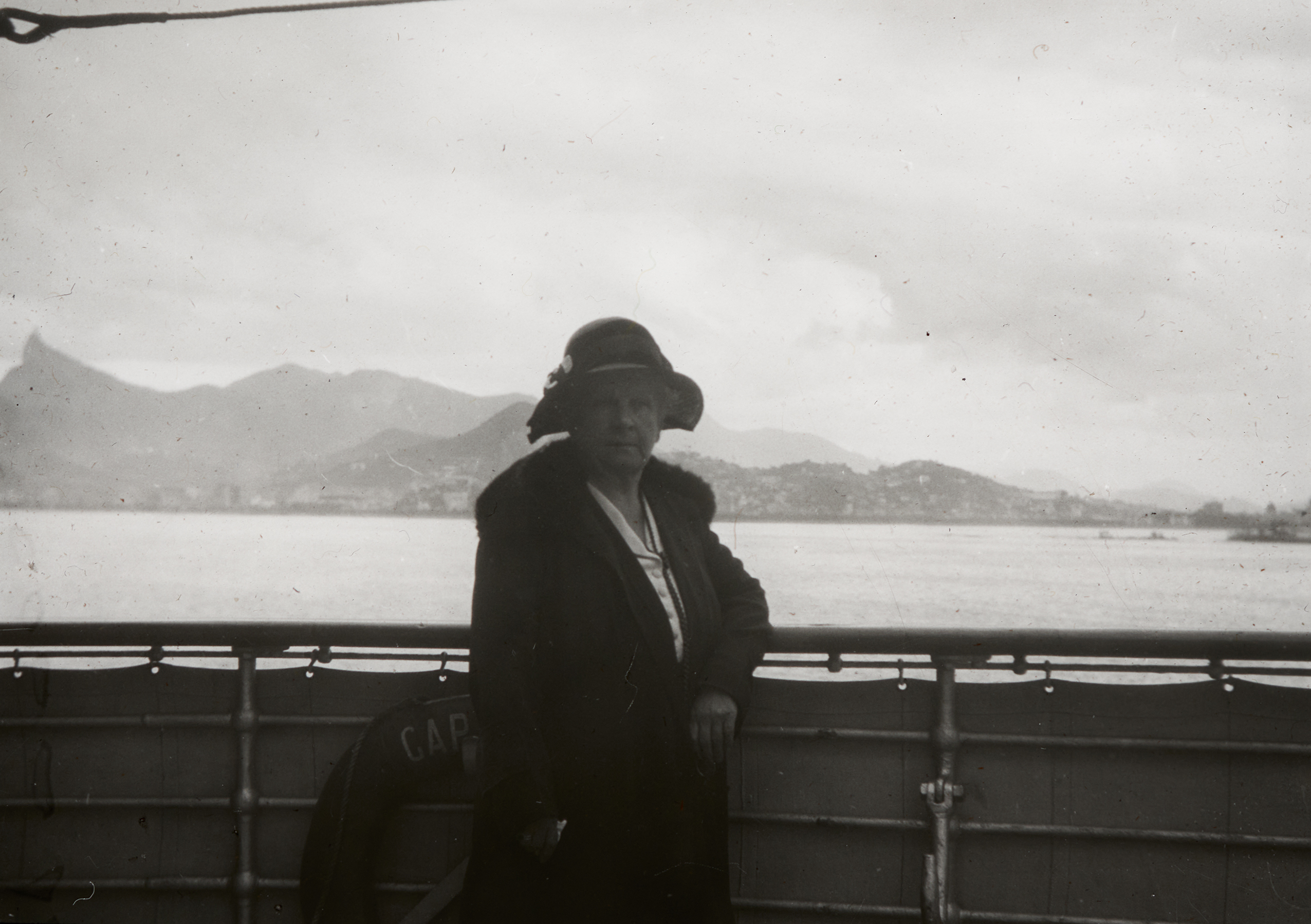 Eine Frau, die auf einem Boot am Meer fotografiert wurde. Im Hintergrund erkennt man eine bergige Landschaft.