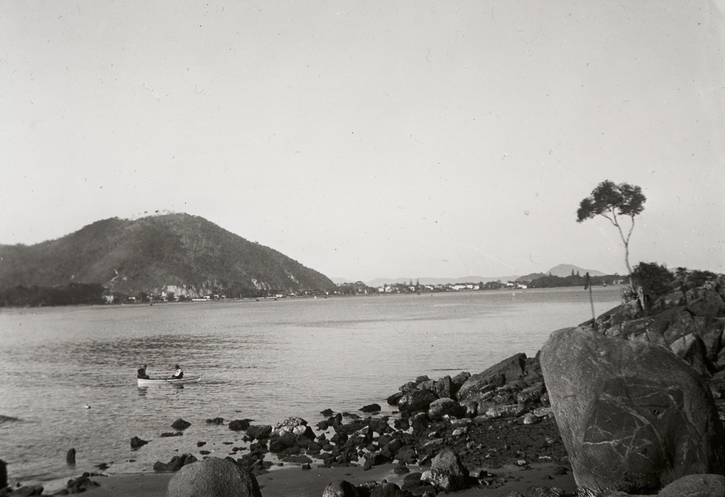 Guanabara-Bucht bei Rio de Janeiro mit Hochhaus im Hintergrund.